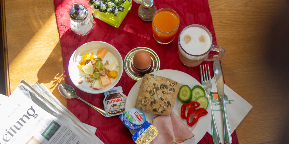 Das Frühstück gibt’s für Hotelgäste unter der Woche von 6.30 bis 9.00 Uhr und am Wochenende und Feiertagen von 7.30 Uhr bis 10.00 Uhr. Übrigens: wir freuen uns auch über externe Gäste, aber bitte vorher reservieren.